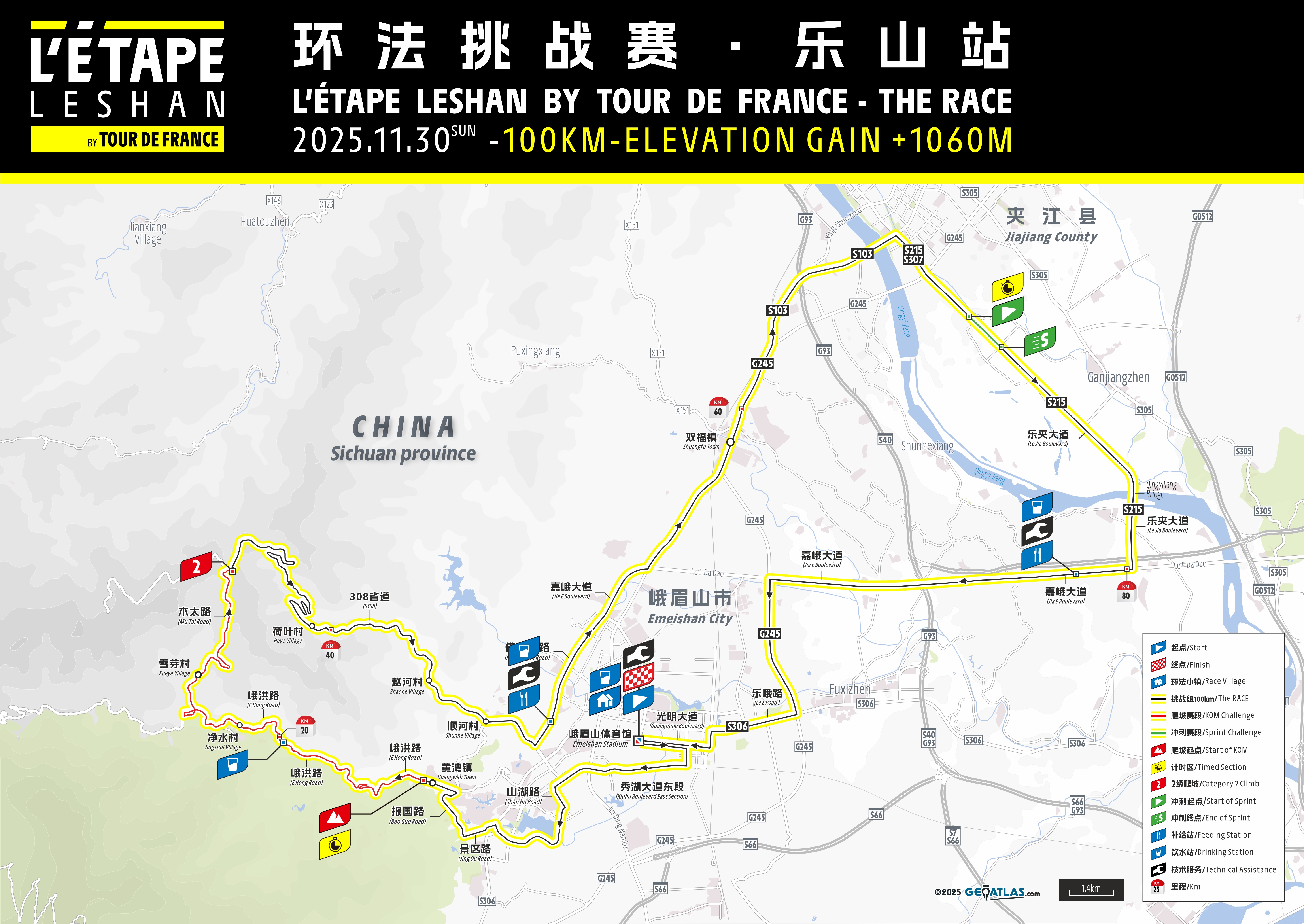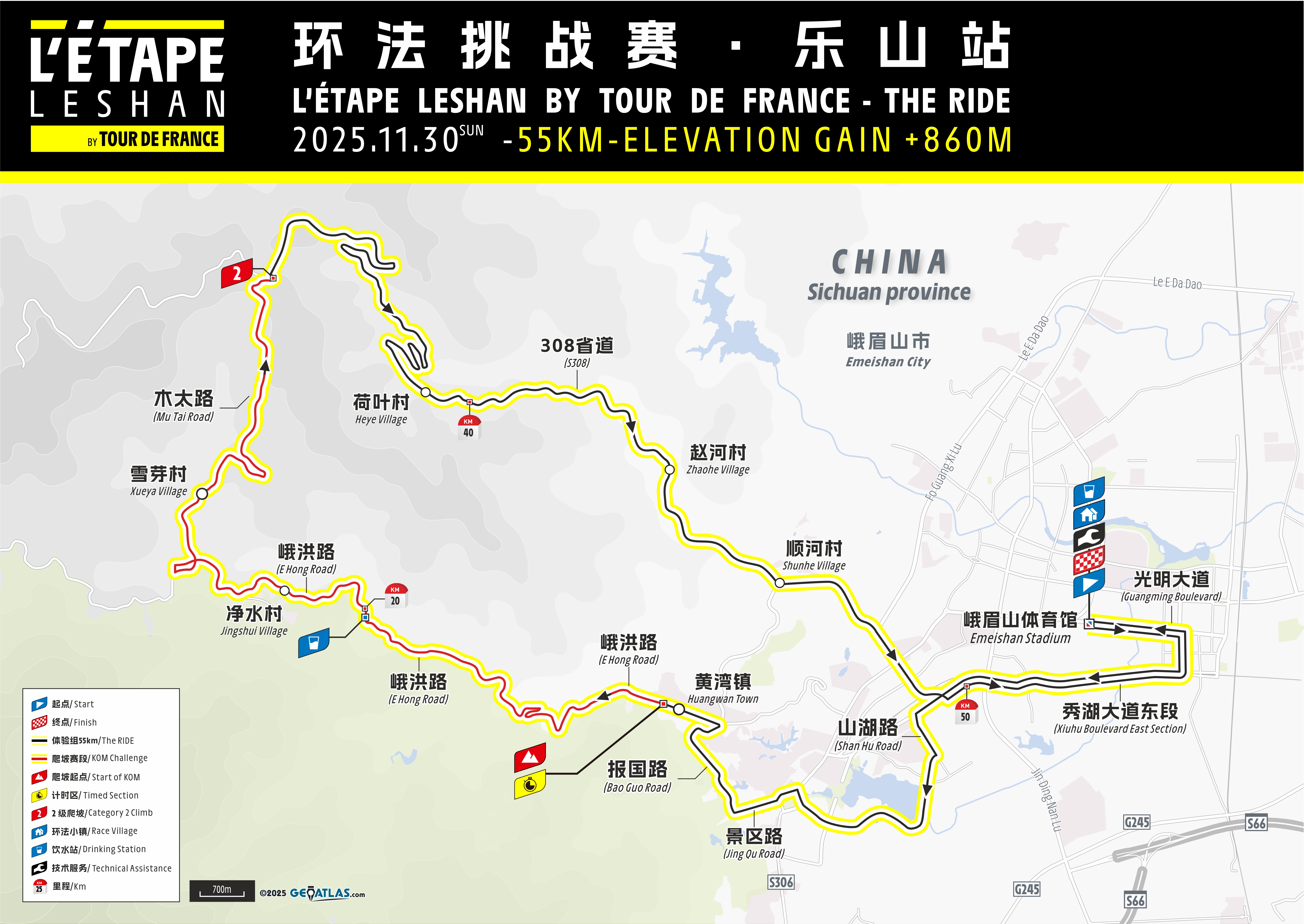 1.The Race:Starting from Emeishan Sports Center → Guangming Avenue → South Section of Shengli Avenue → Xiuhu Avenue → Shanhu Road → Wenquan Avenue → Tianxia Mingshan → Jingqu Road → Baoguo Road → Ehong Road → Mutai Road → Xueya Village → Provincial Road S308 → Zhahe Village → WestRing Road (S308) → Old S103 → National Highway G245 → S103 → Cidu Avenue → Qingyi River Bridge → Lejia Avenue → Jia’e Avenue → G245 → Lexi Section of Le’e Road → Mingshan Square → Nanchen Street → Guangming Avenue → Emeishan Sports Center (Finish).